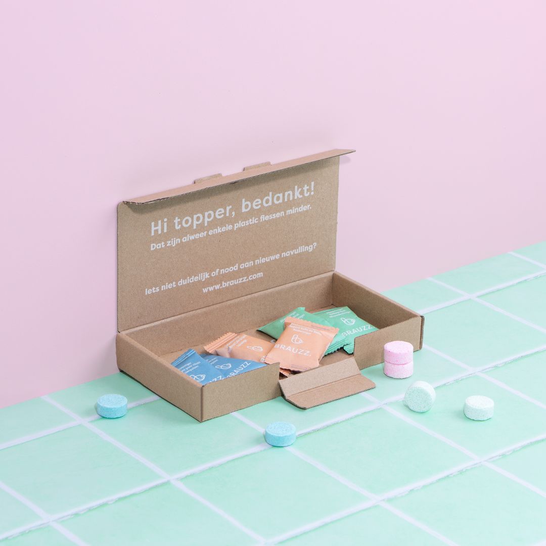 Met de BRAUZZ. badkamer startersbundel zet jij een stapje richting een schone en plasticvrije badkamer. Ook het kleinste kamertje kan je er duurzaam mee schoonmaken!
